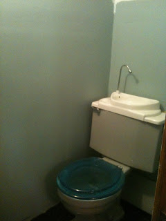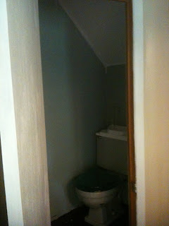 This is the "before", except that you can see the new black floor and I've already painted the ceiling gloss white. Sorry the pictures aren't better, but the room is soooo tiny, I can barely get a shot of it.